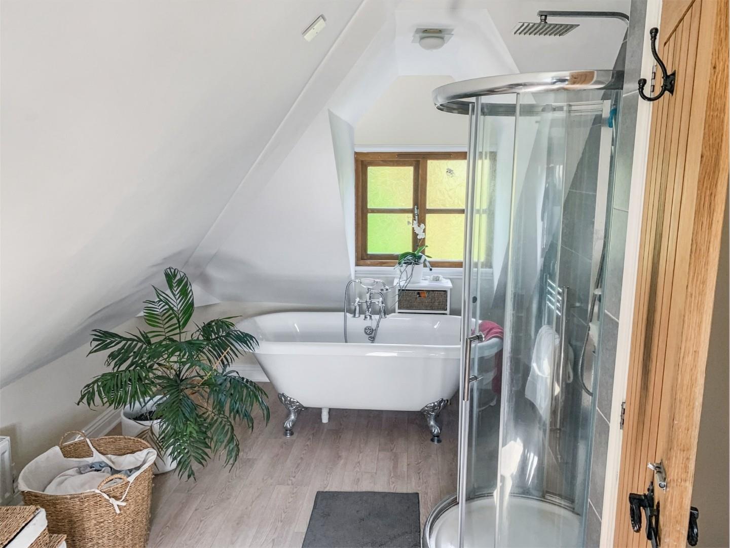 Spacious bathroom with free standing bath, separate shower cubicle , WC and wash hand basin.