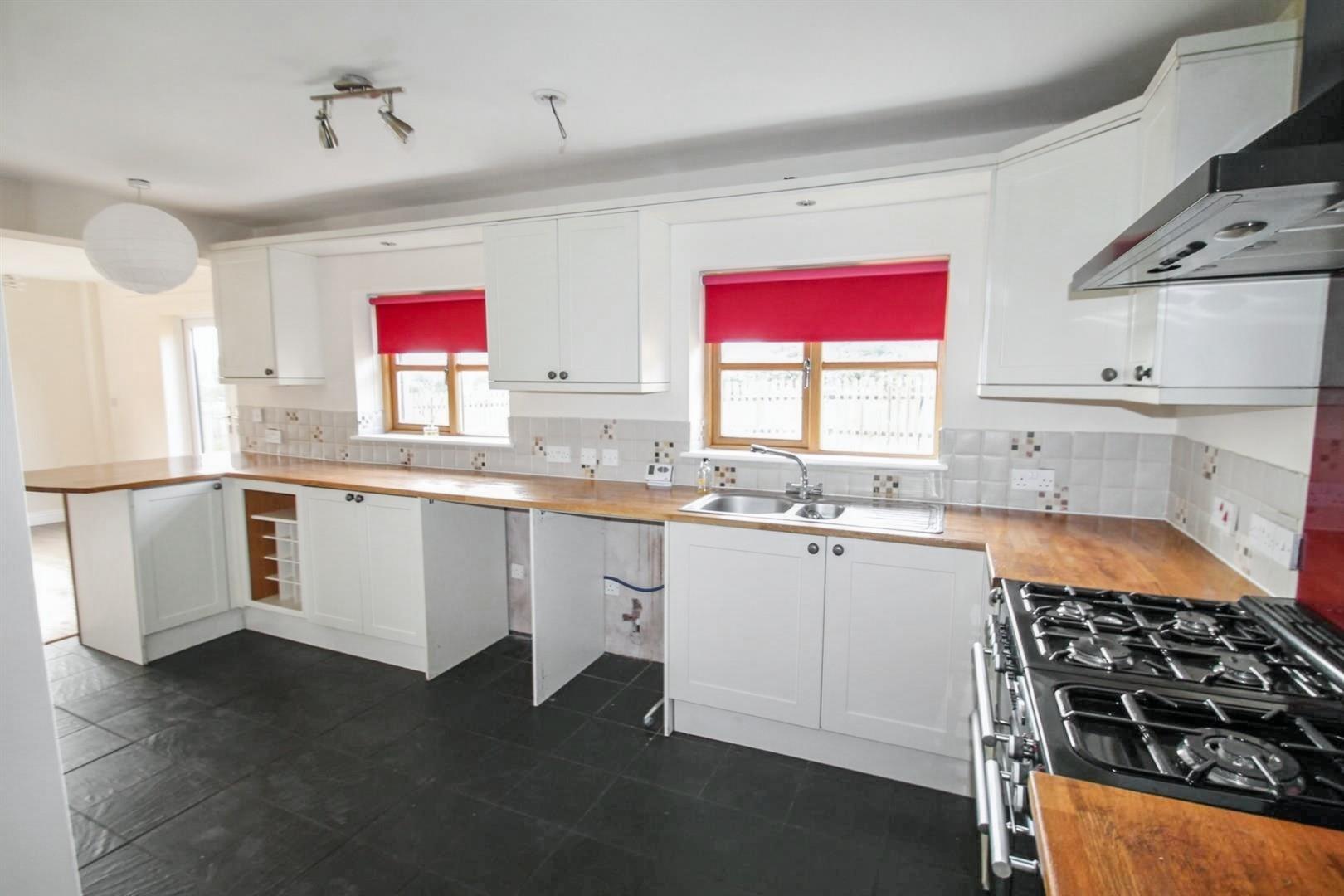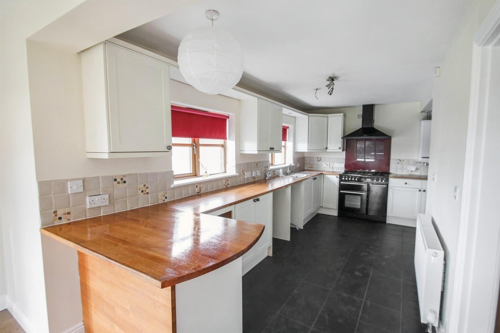 Spacious kitchen with a range of storage cupboards, large cooker, space for further appliances.
