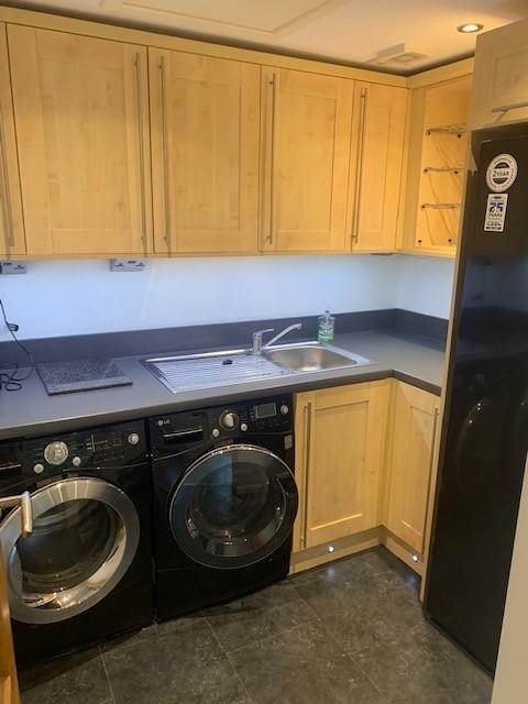 With LG dryer and LG washing machine and large free standing American style fridge/ freezer.