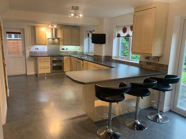 Breakfast kitchen with range of cupboards, built in dishwasher, fridge/freezer, sink and drainer, wall mounted TV. Door to side and to rear garden. Door to Utility.