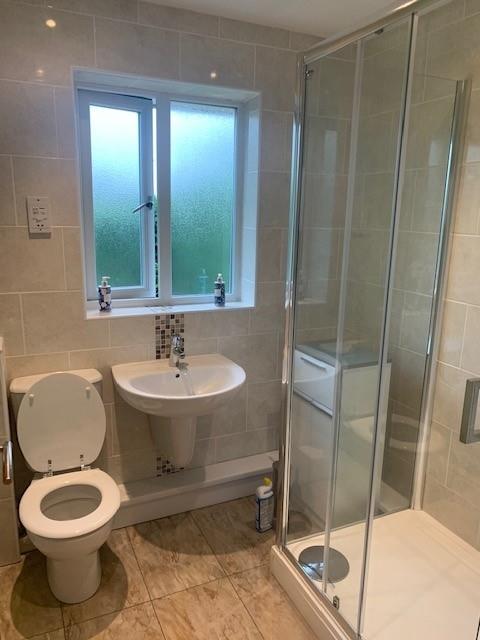 With double walk in shower cubicle, wash hand basin and WC