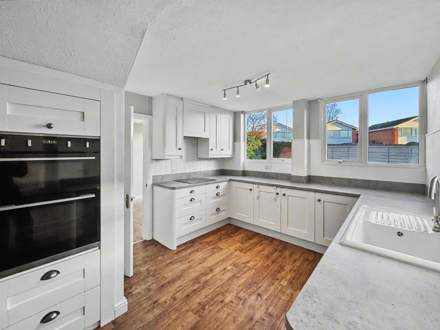 Having been extended into the garage this great sized kitchen has a range of storage cupboards, sink, drainer and double oven, hob with extractor above and with further space and plumbing for other appliances.