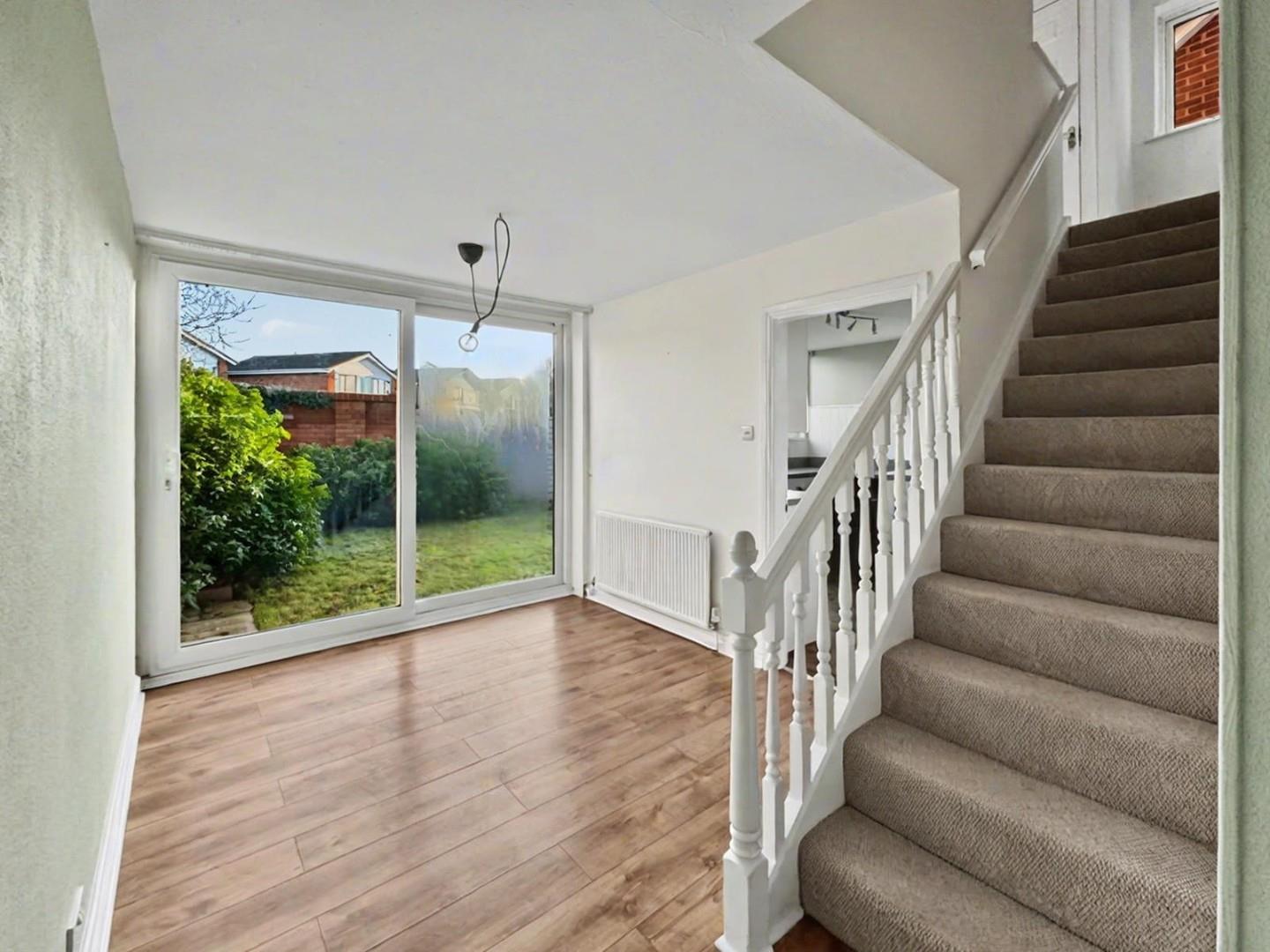 With sliding patio doors to rear garden, door to kitchen and stairs to first floor.