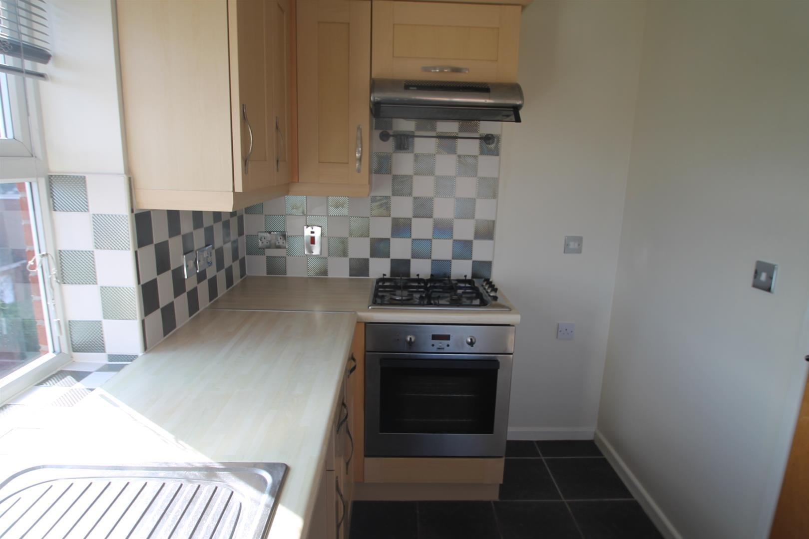 With gas hob and oven, a range of storage cupboards and space for further appliances. Windows to the front and side.