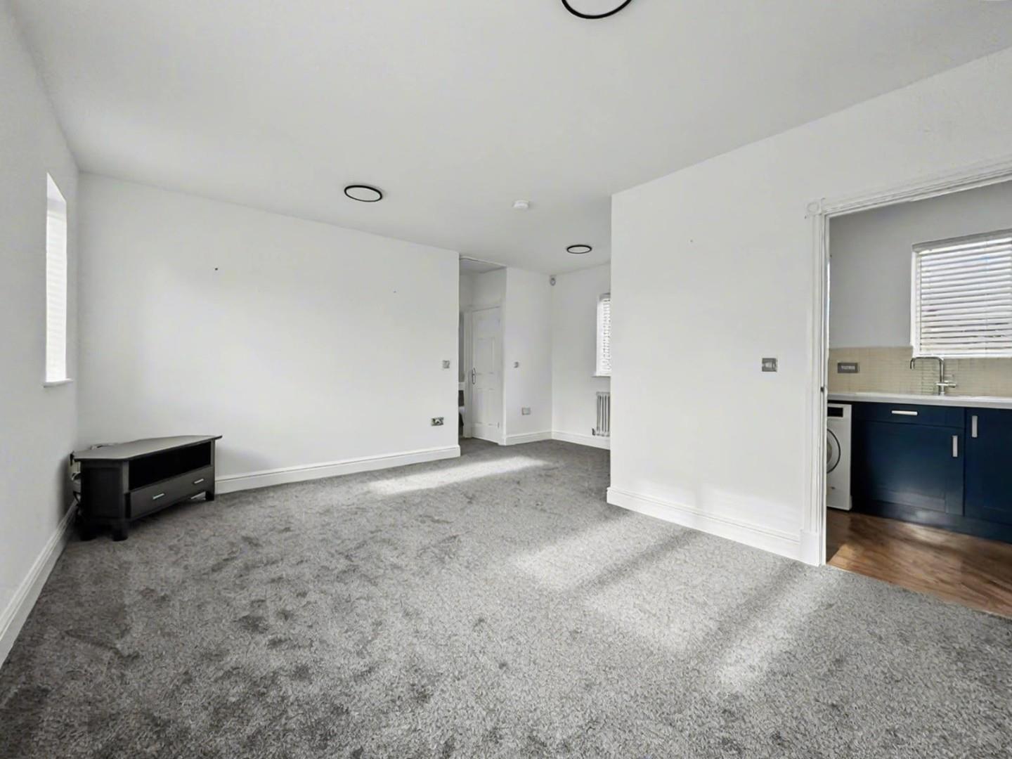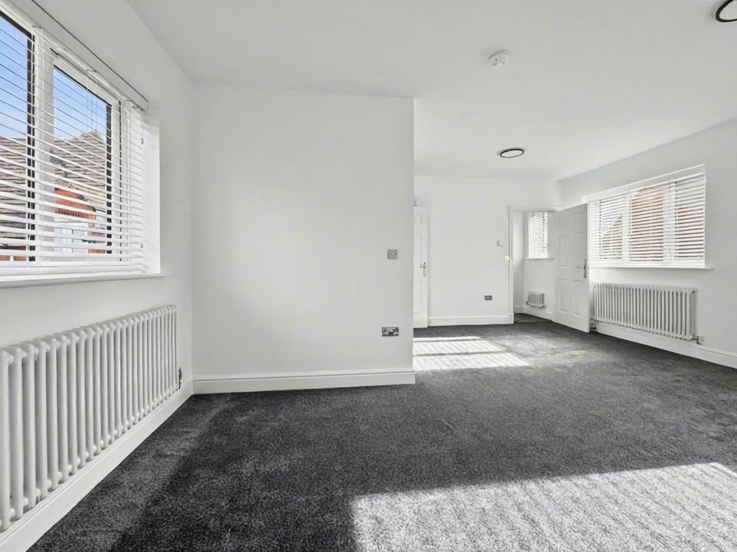 Spacious living room with space for lounge and dining furniture, windows to front and back, doors leading to Kitchen, Bathroom and Bedroom.