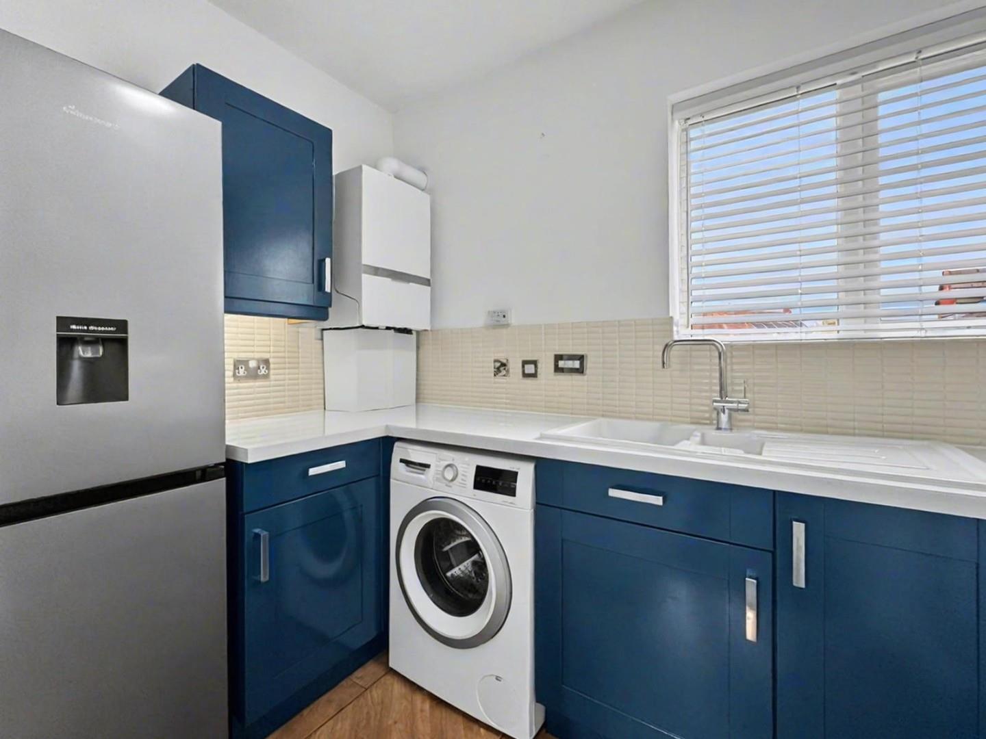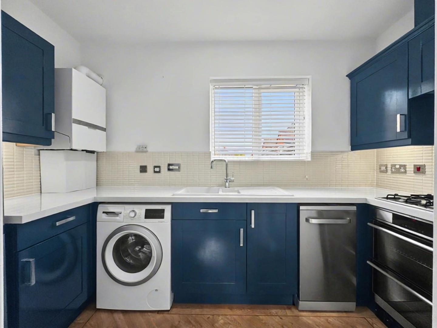 Modern fitted kitchen with a range of storage cupboards, sink and drainer, washing machine, dishwasher, fridge/freezer, oven, hob and extractor above.