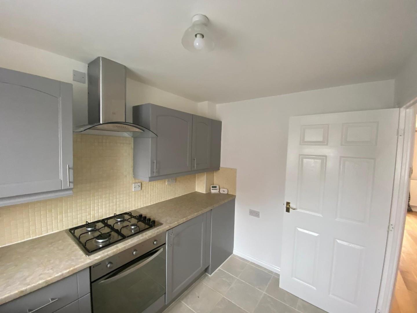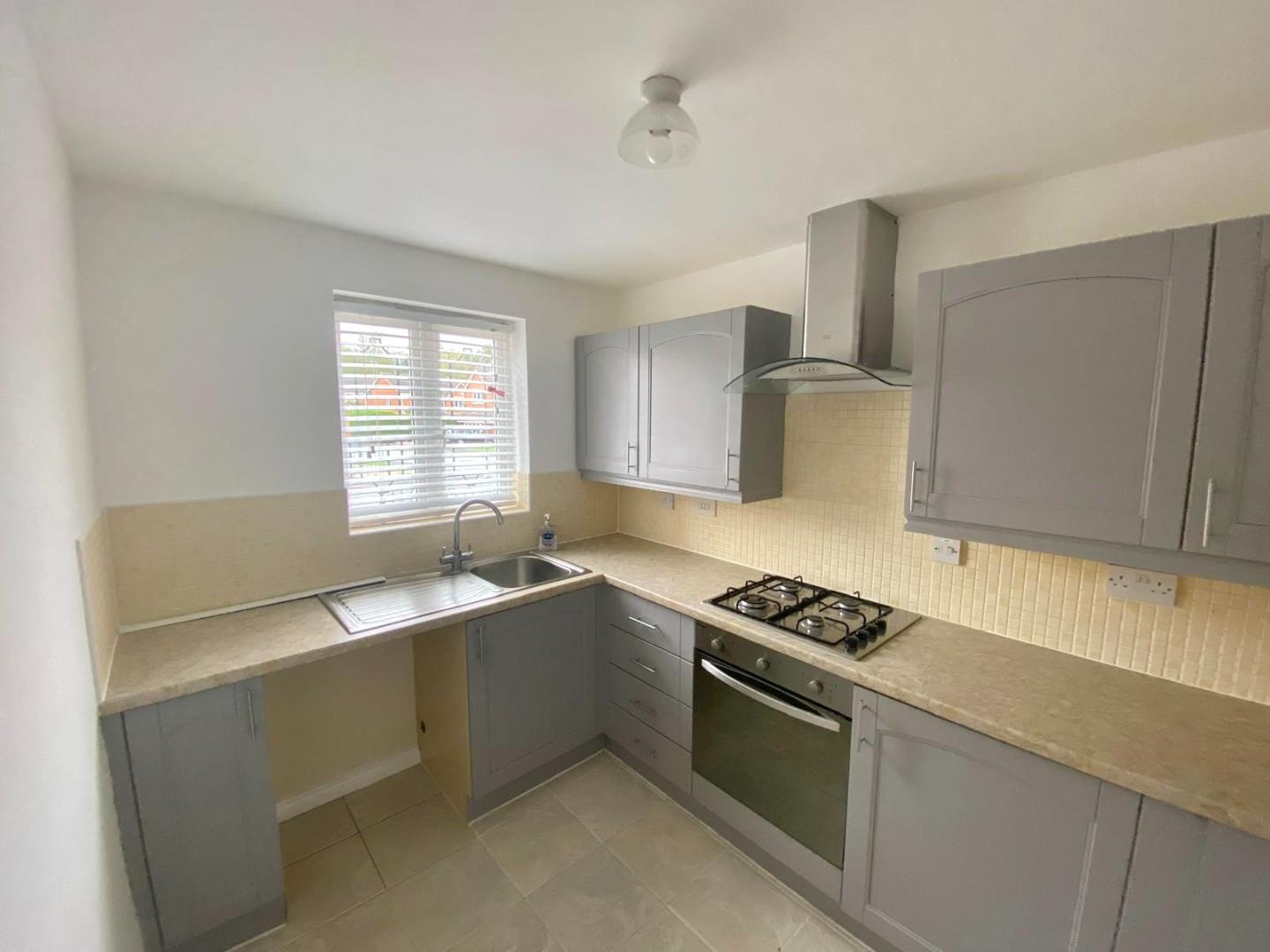 Modern fitted kitchen with cooker, space for a fridge/freezer and space for washing machine.