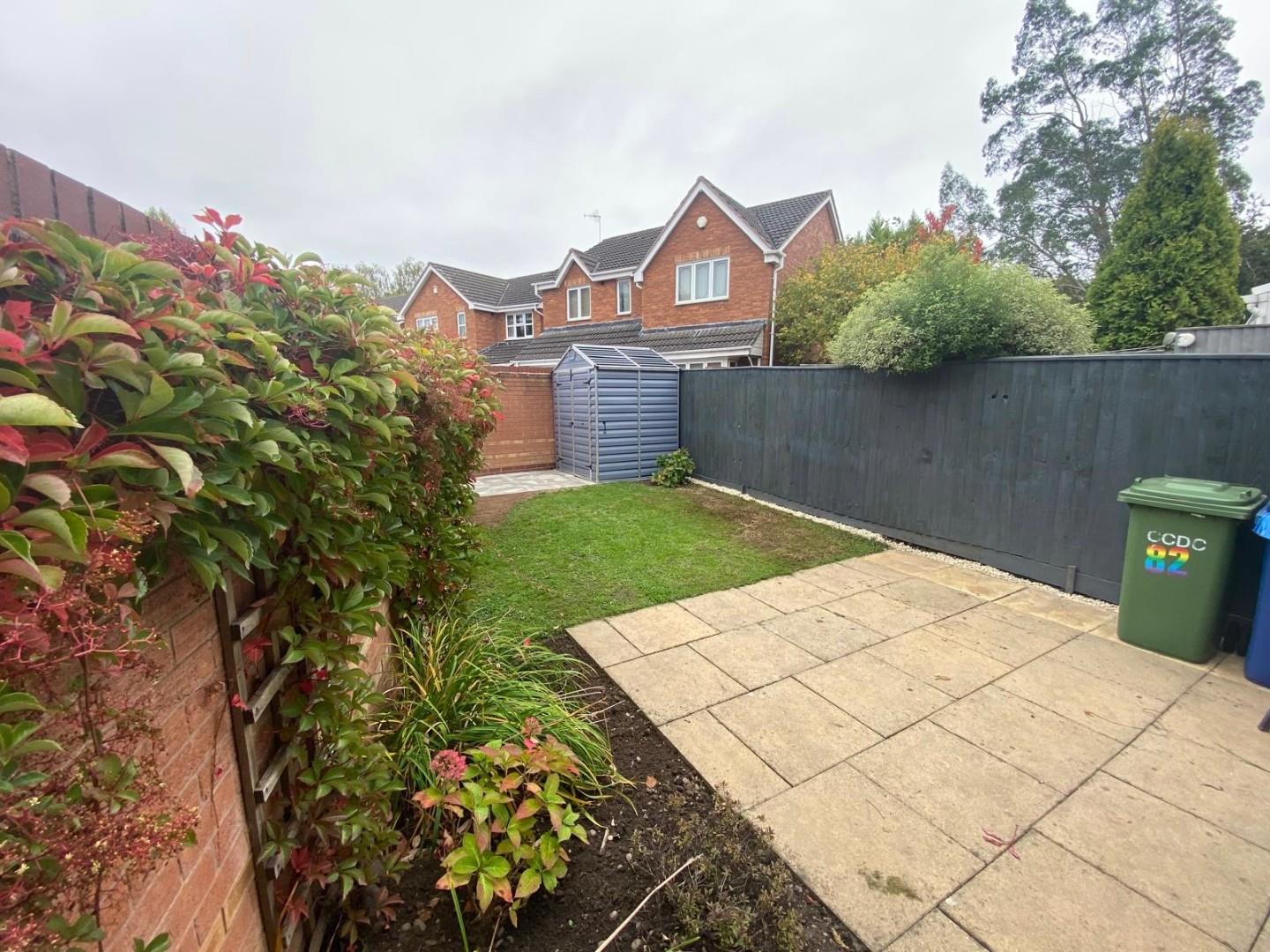 With parking to the front and a rear garden with patio and lawn and a shed.