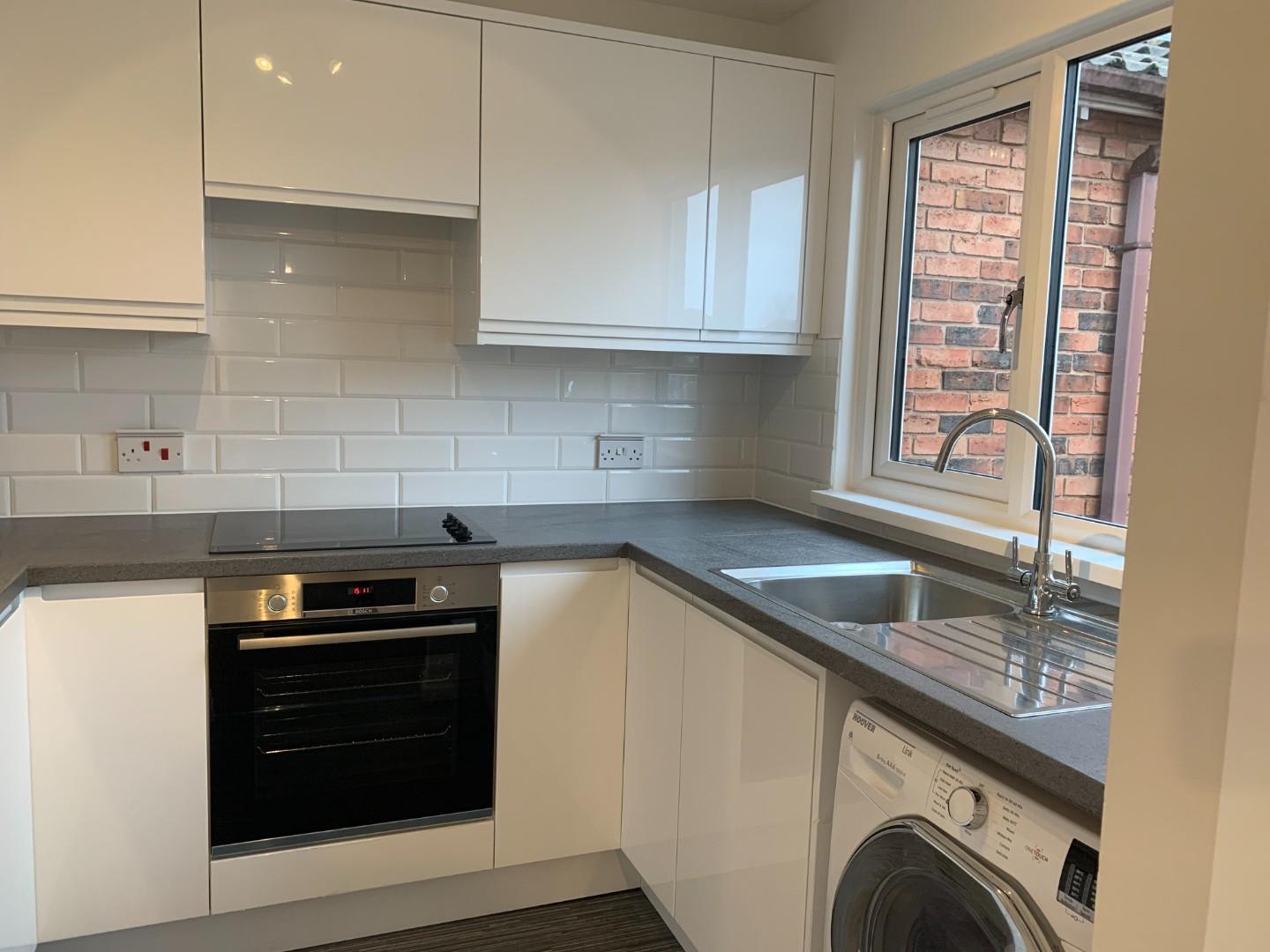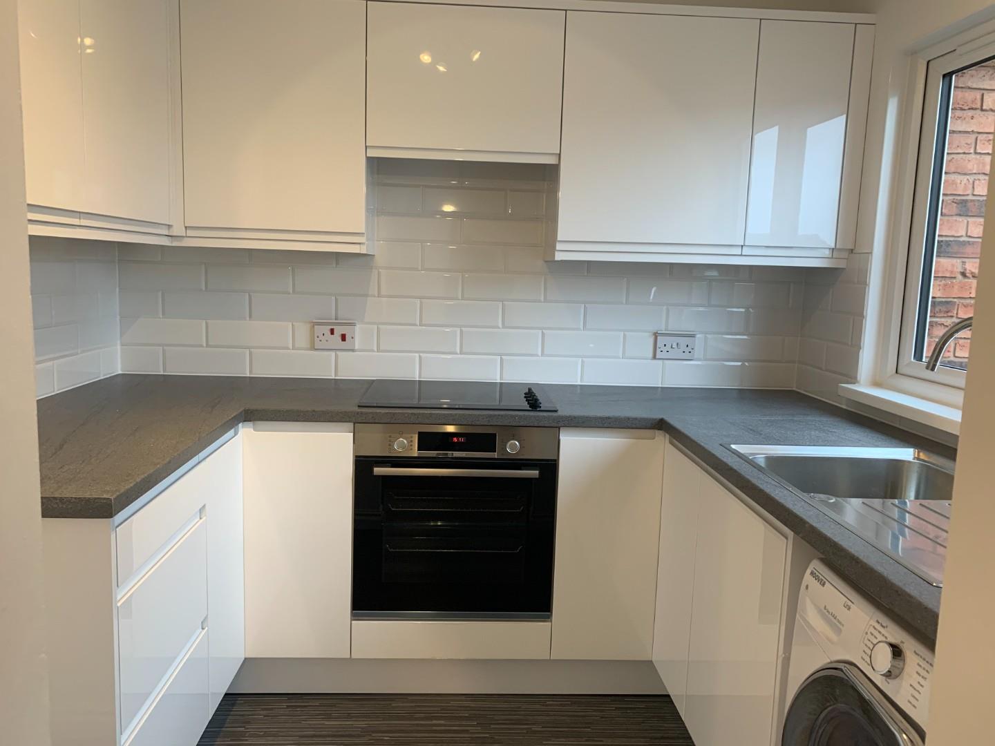 Newly fitted modern kitchen with built in cooker, sink and drainer, a range of storage cupboards and space for fridge / freezer.