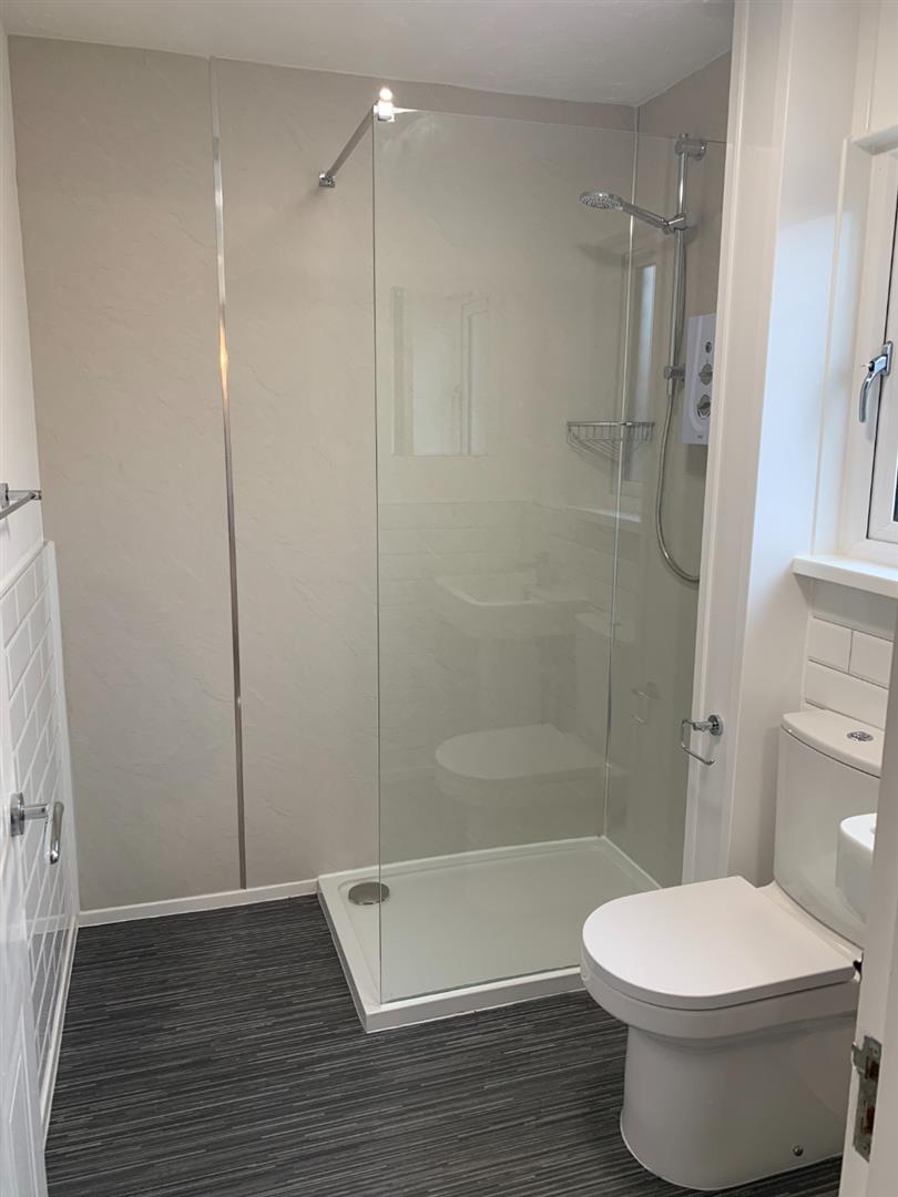 Newly fitted shower room with walk in double shower, wash hand basin and WC.