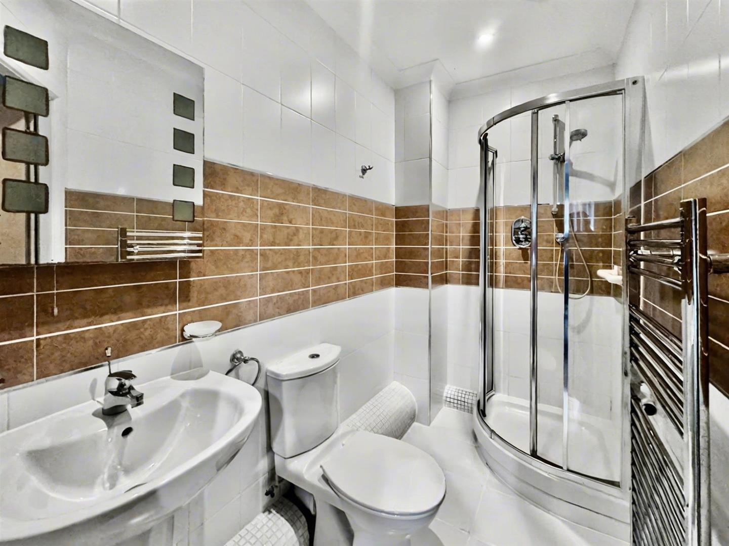 With suite comprising of corner shower cubicle, wash hand basin and WC.