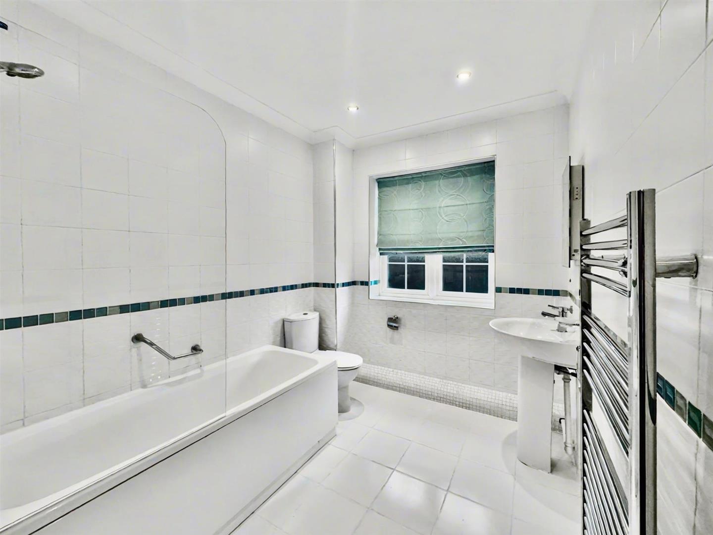 With suite comprising of bath with shower above, wash hand basin and WC.