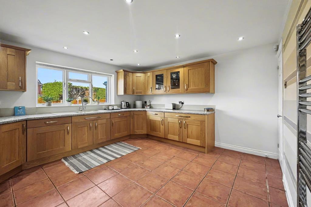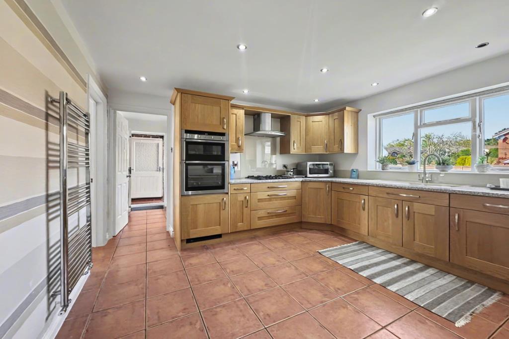 Spacious breakfast kitchen with a range of storage cupboards, sink and drainer, double oven, integral fridge, integral dishwasher, space for breakfast table and chairs, window to rear garden and doors to Hallway, Dining Room and to Utility.