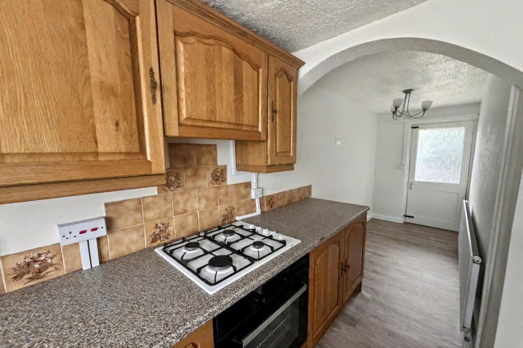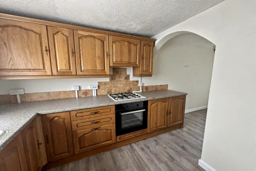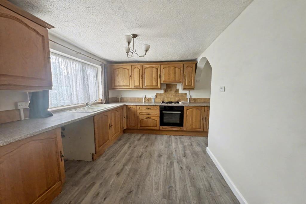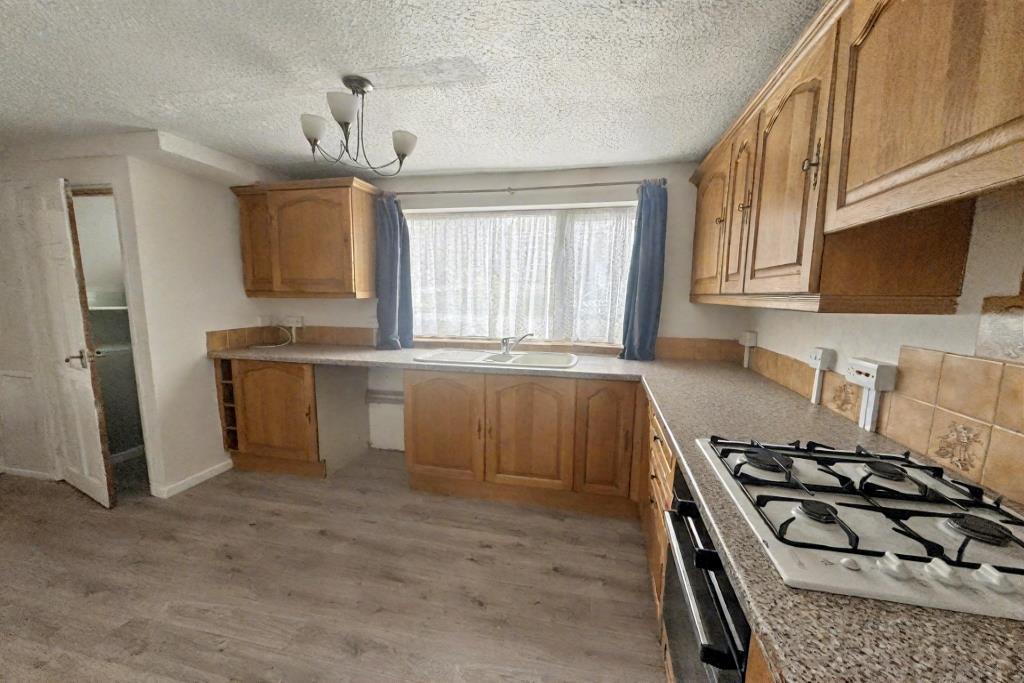 Good sized fitted kitchen with a range of storage cupboards, cooker with hob, space and plumbing for appliances and with window to fore.
