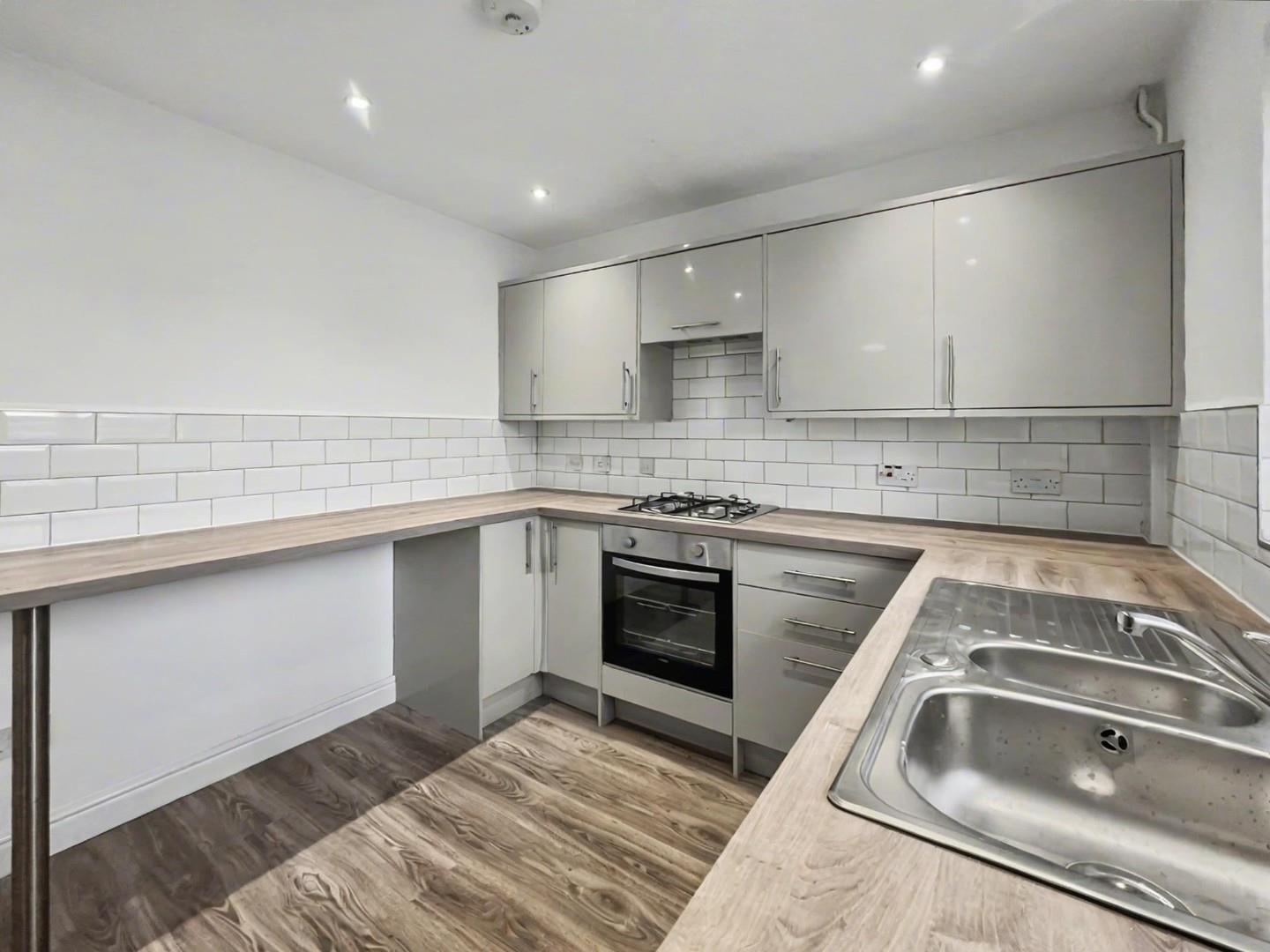 Modern kitchen with integrated oven/gas hob and extractor overhead, kitchen cupboards and space for appliances.