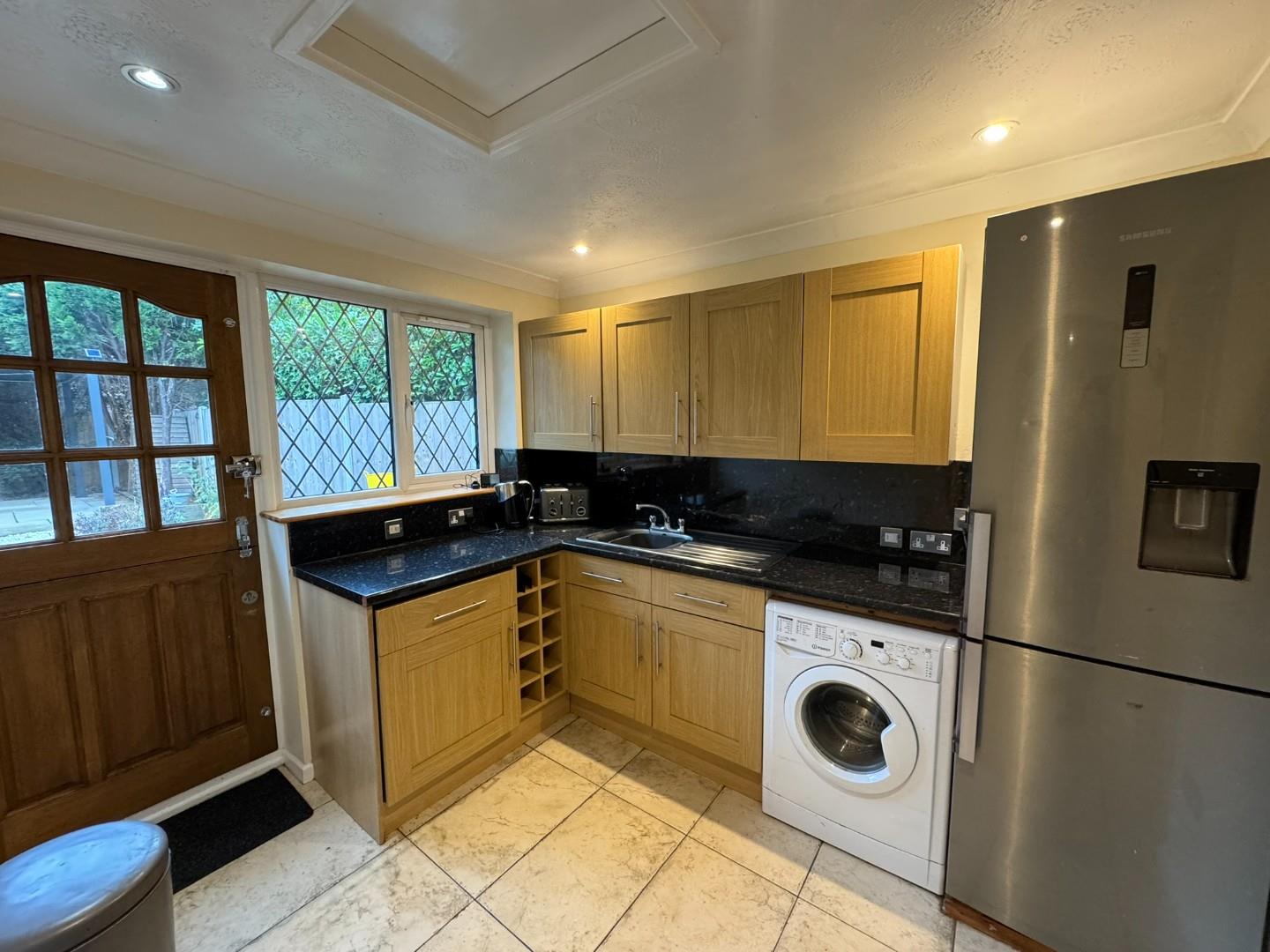 Spacious fitted kitchen with whitegoods, double oven with gas hobs and a double sink.