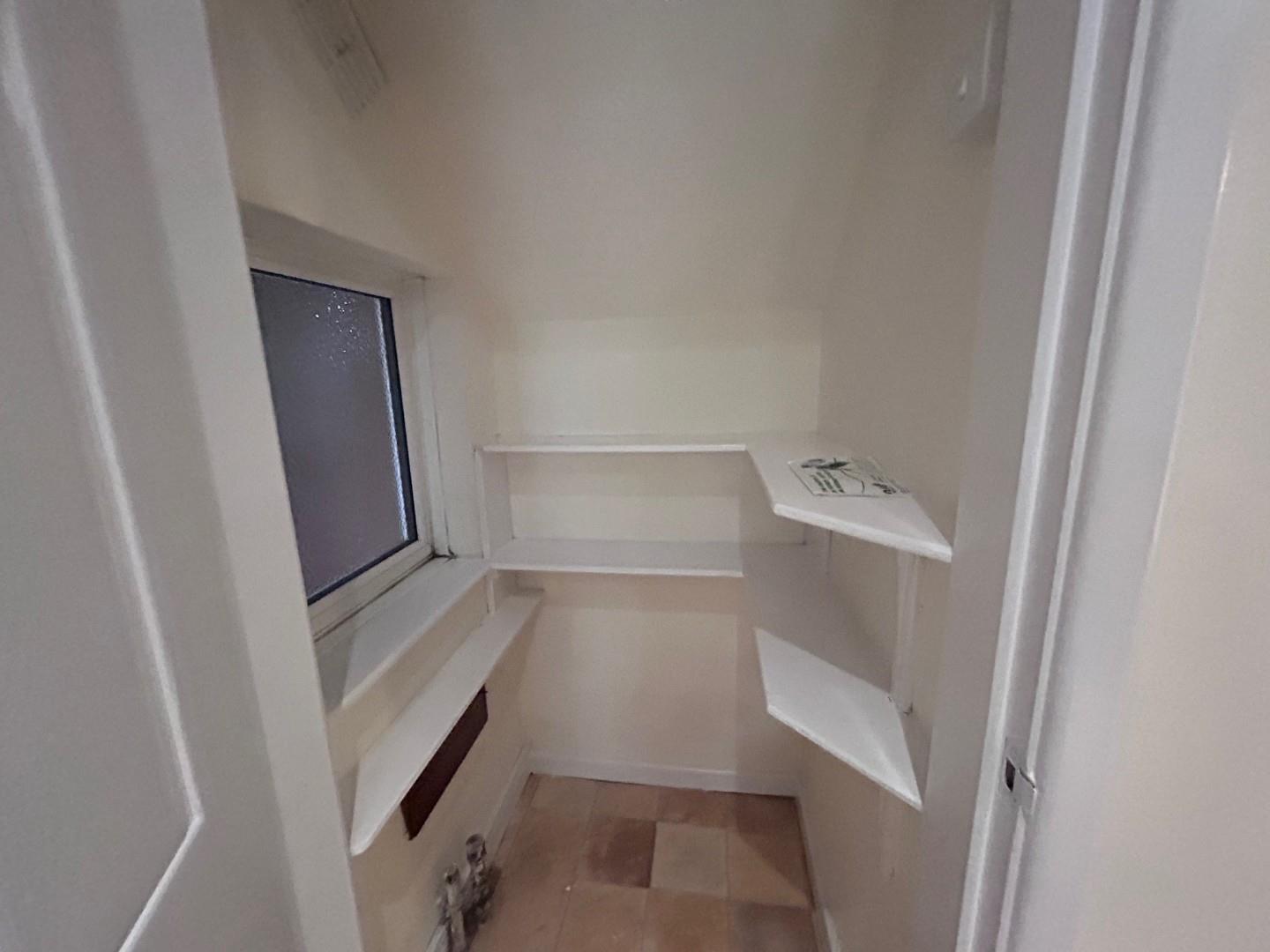 Fitted kitchen with a range of storage cupboards, cooker with hob over, useful pantry and window to rear.
