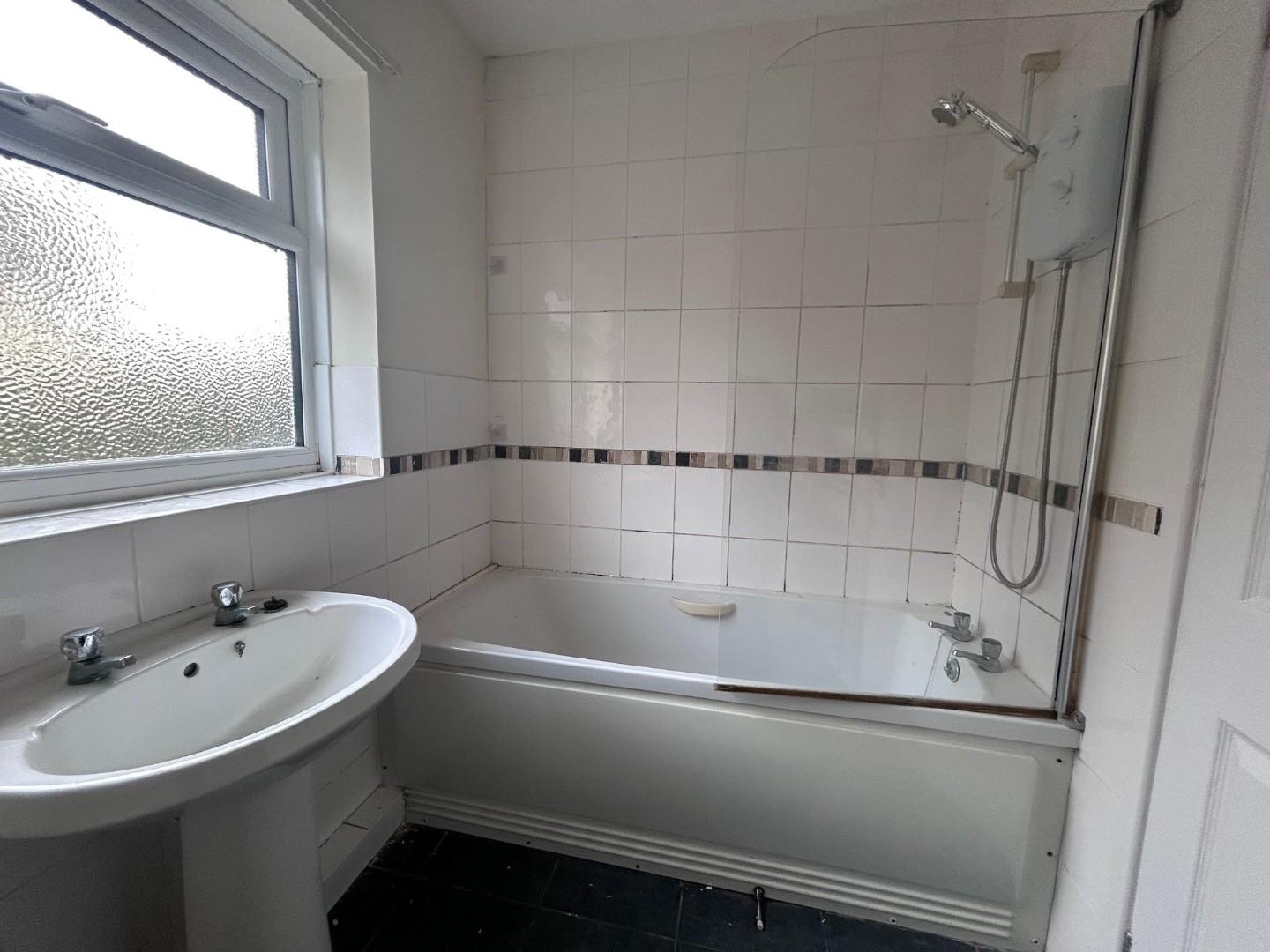 With suite comprising of bath with shower above, wash hand basin and WC.