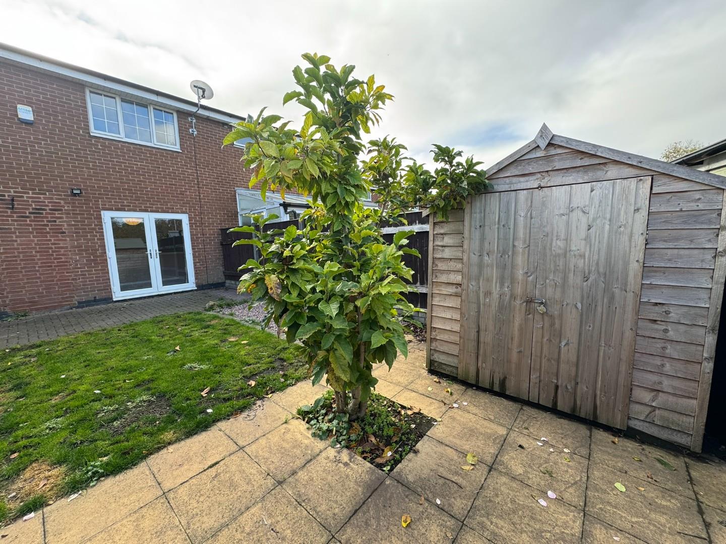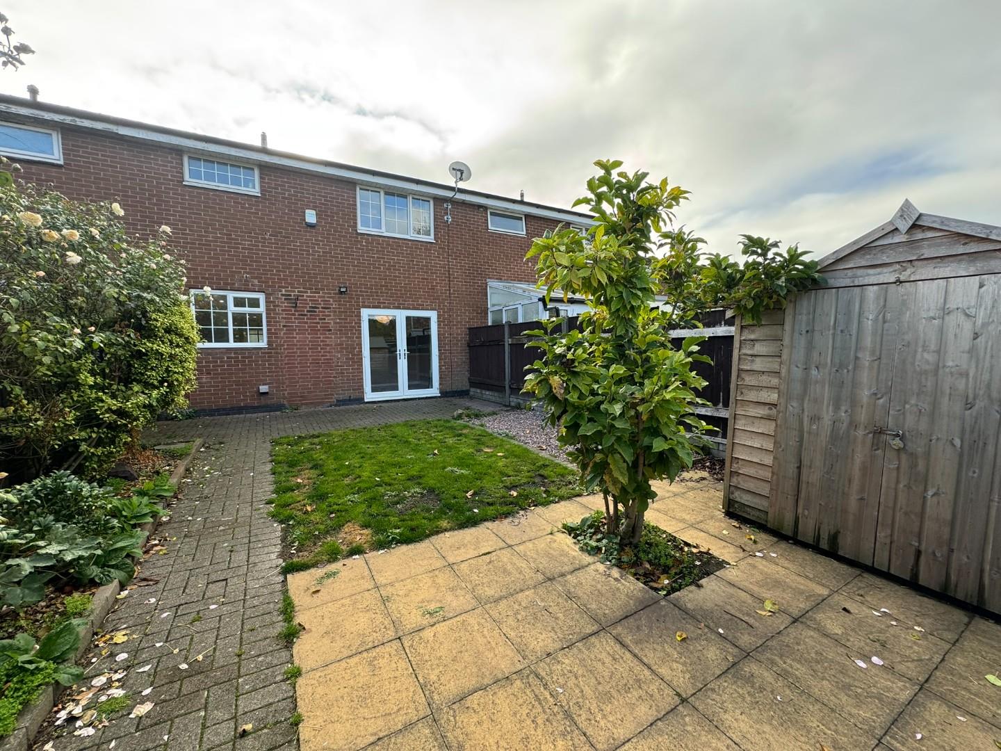 Private rear garden with a back gate leading into the communal car park and lawn at the front of the property.