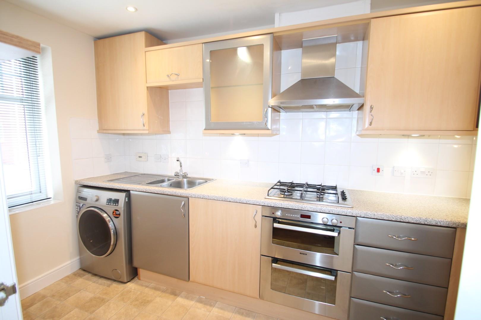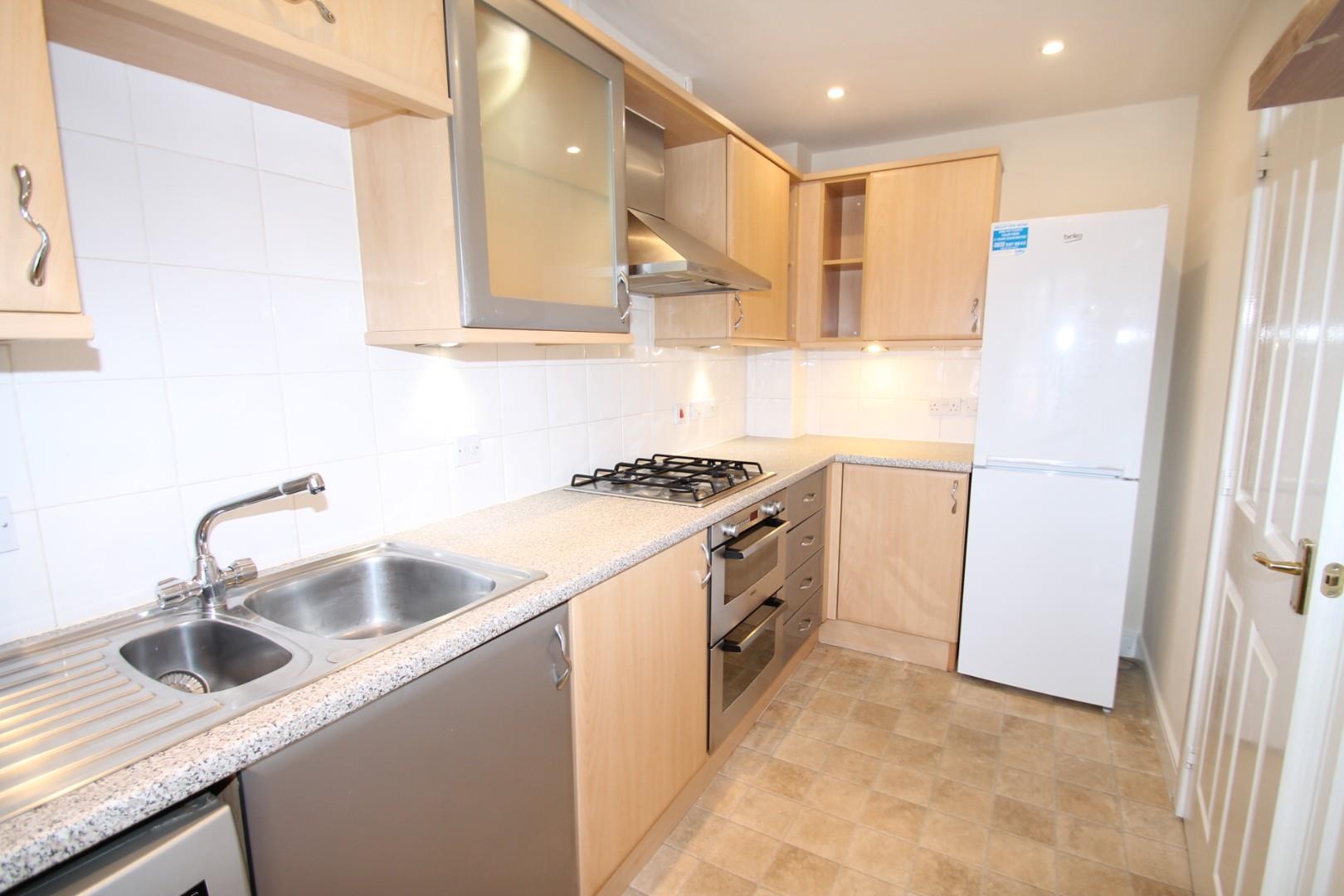 With storage cupboards, cooker with extractor fan, fridge/freezer and washing machine.